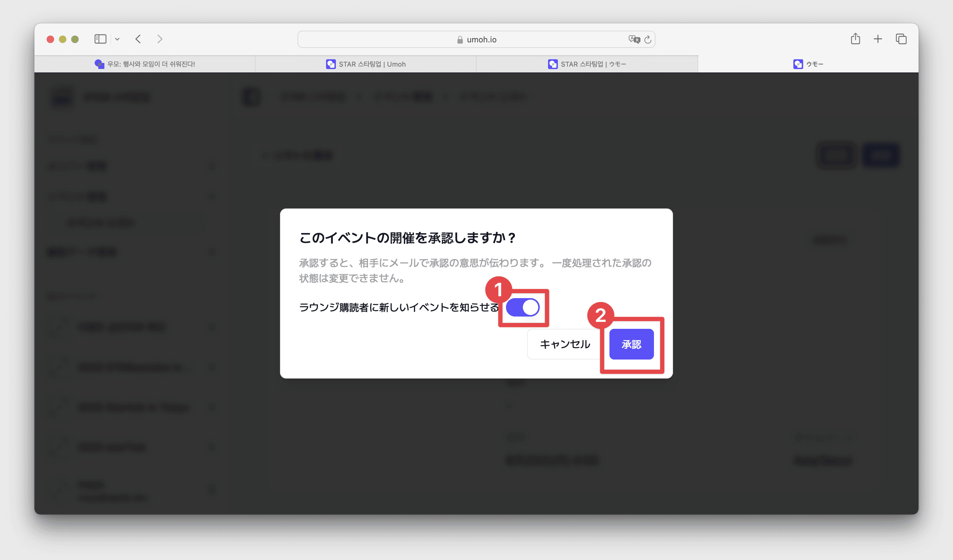 • 「ラウンジ購読者に新イベントを知らせる」文言右の[スイッチ]をクリック → [承認する]をクリック