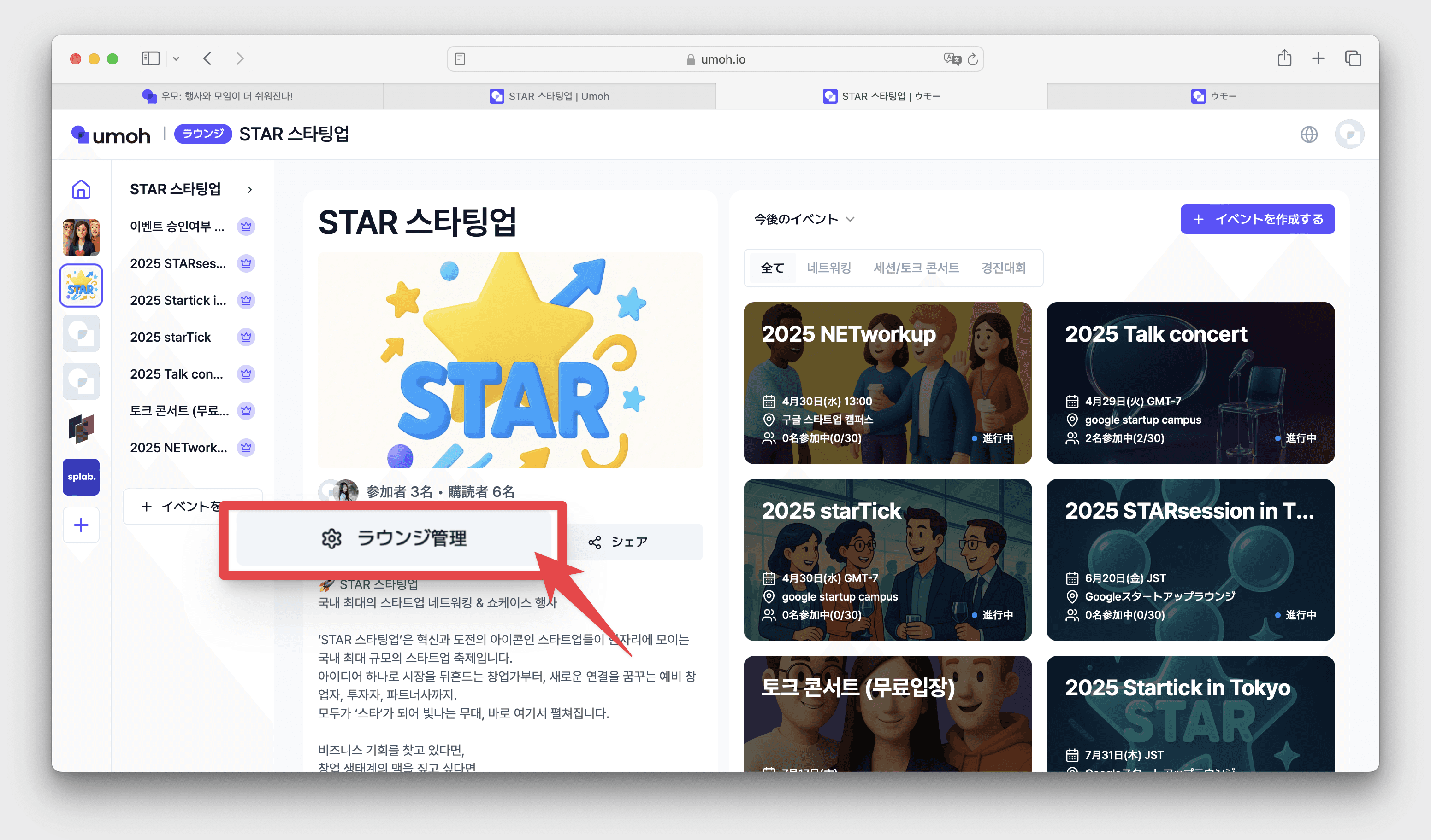 • ラウンジ代表画像下の[ラウンジ管理]をクリック