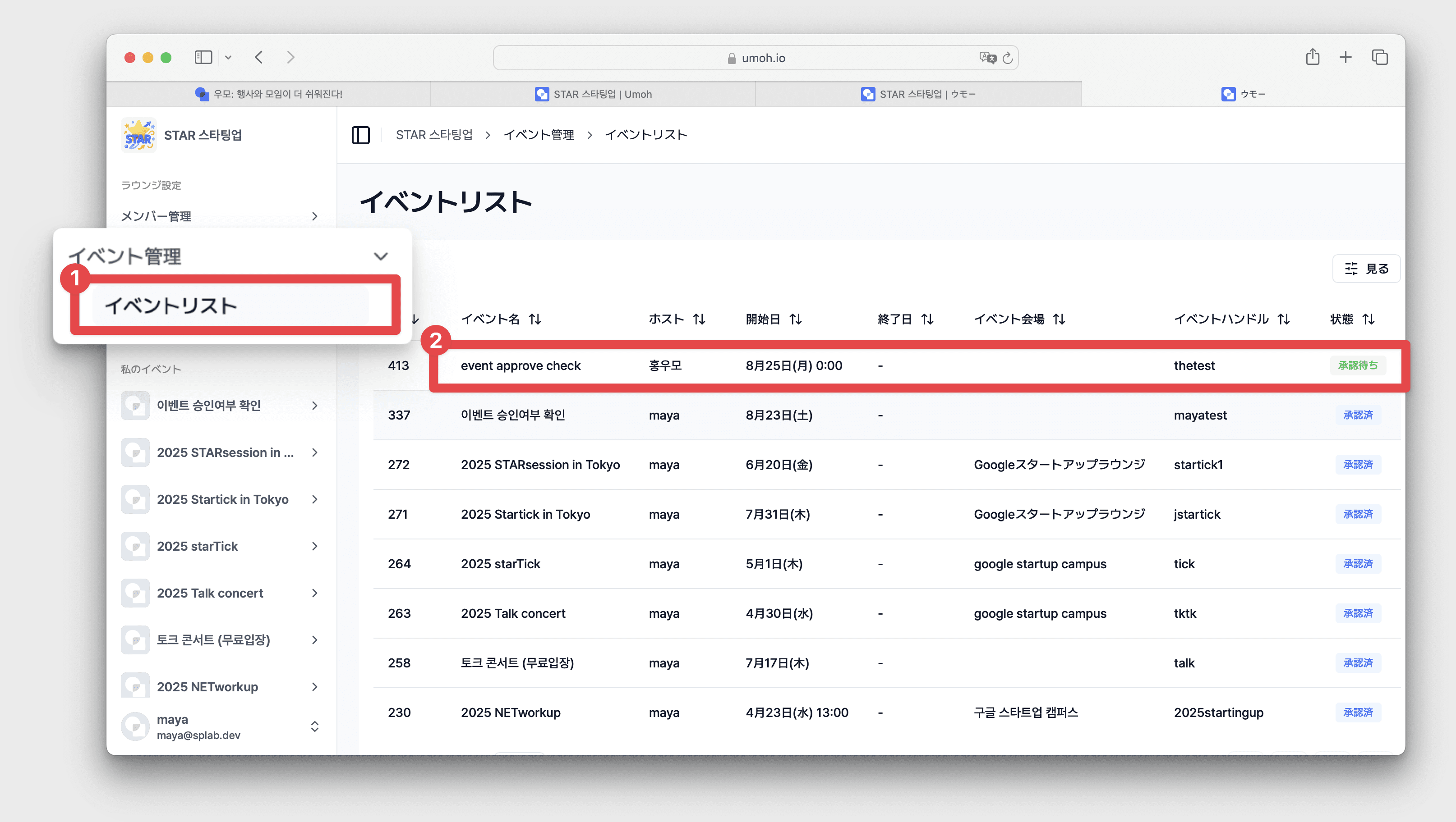 • ラウンジ管理ダッシュボード左側サイドバーの[イベントリスト]をクリック