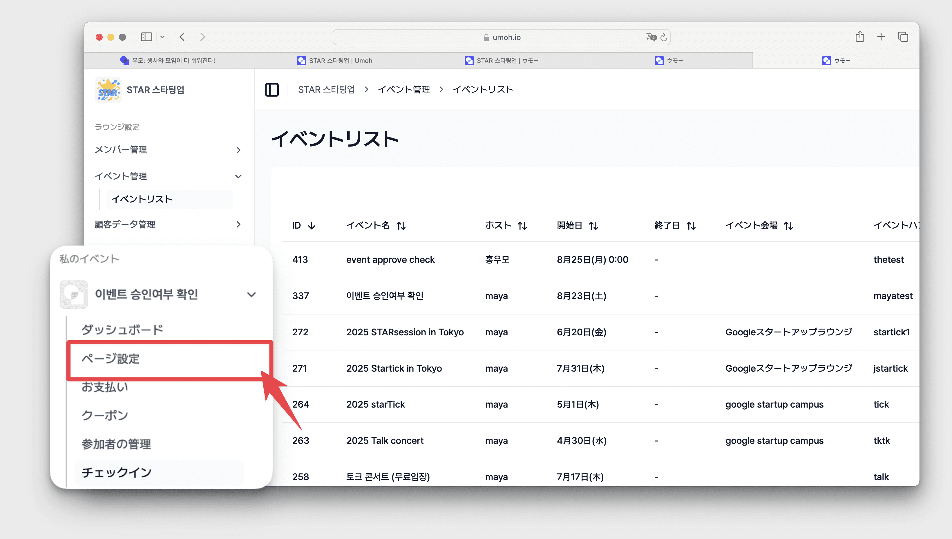 • ラウンジ管理ダッシュボード左側の[私のイベント]を確認 → イベント[ページ設定]をクリック