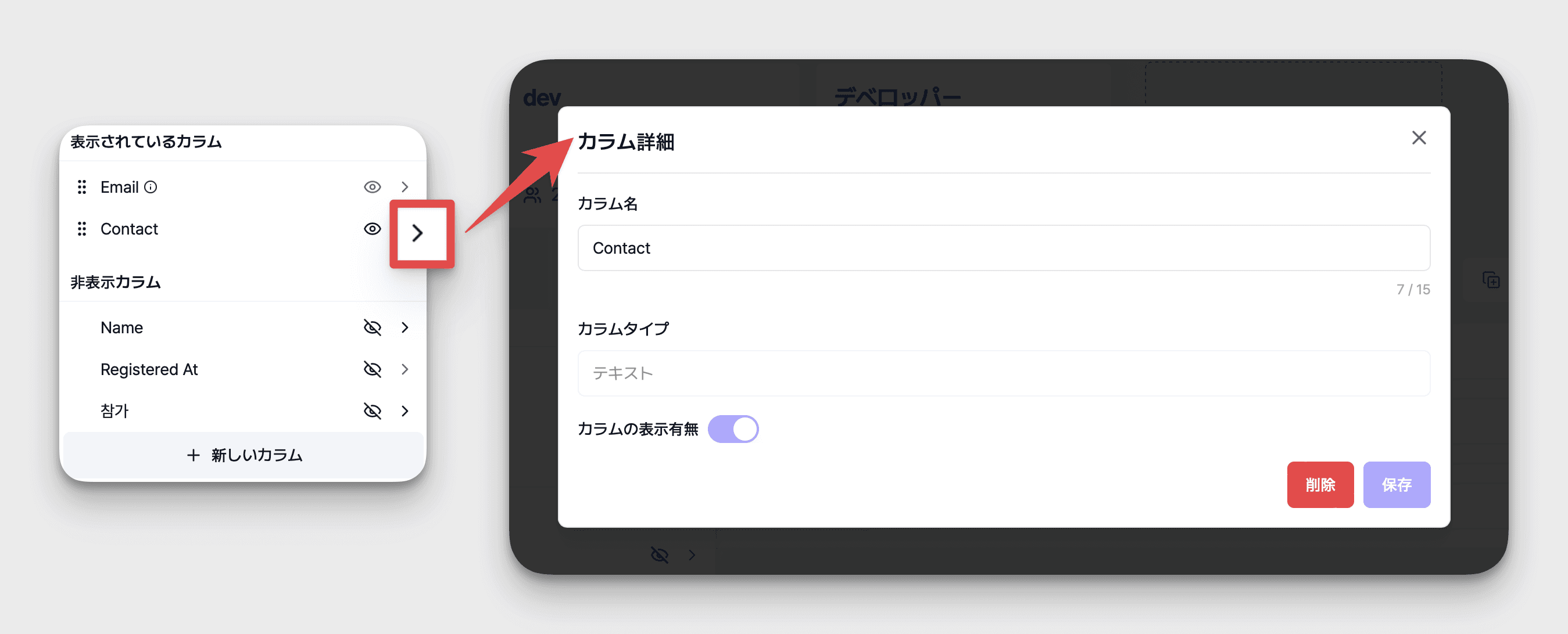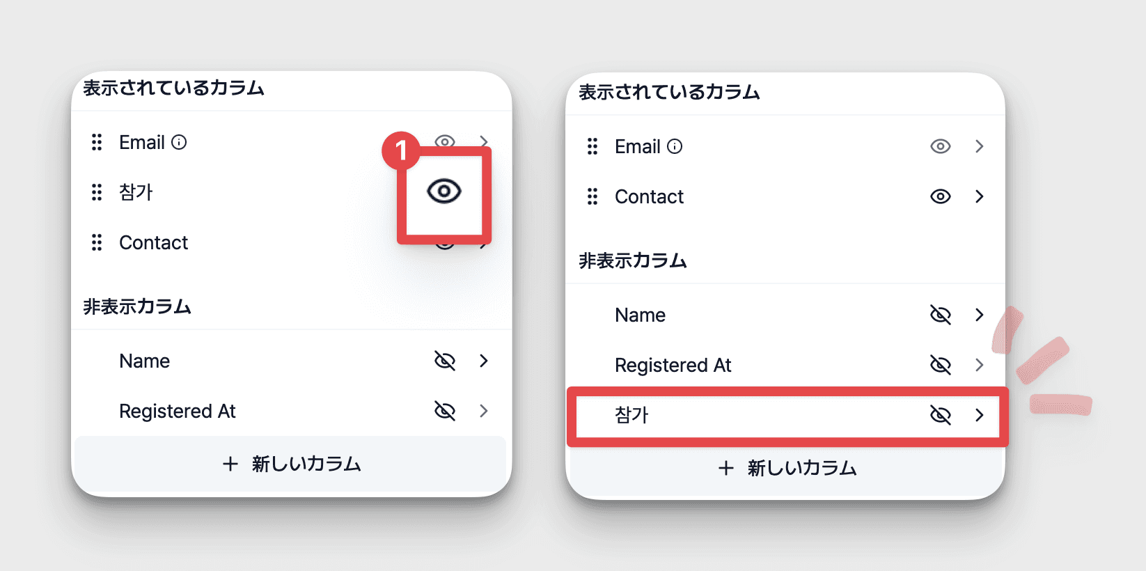 • [表示された属性]リストで非表示にしたい属性項目の[👁️]ボタンをクリック → [非表示の属性]に移動