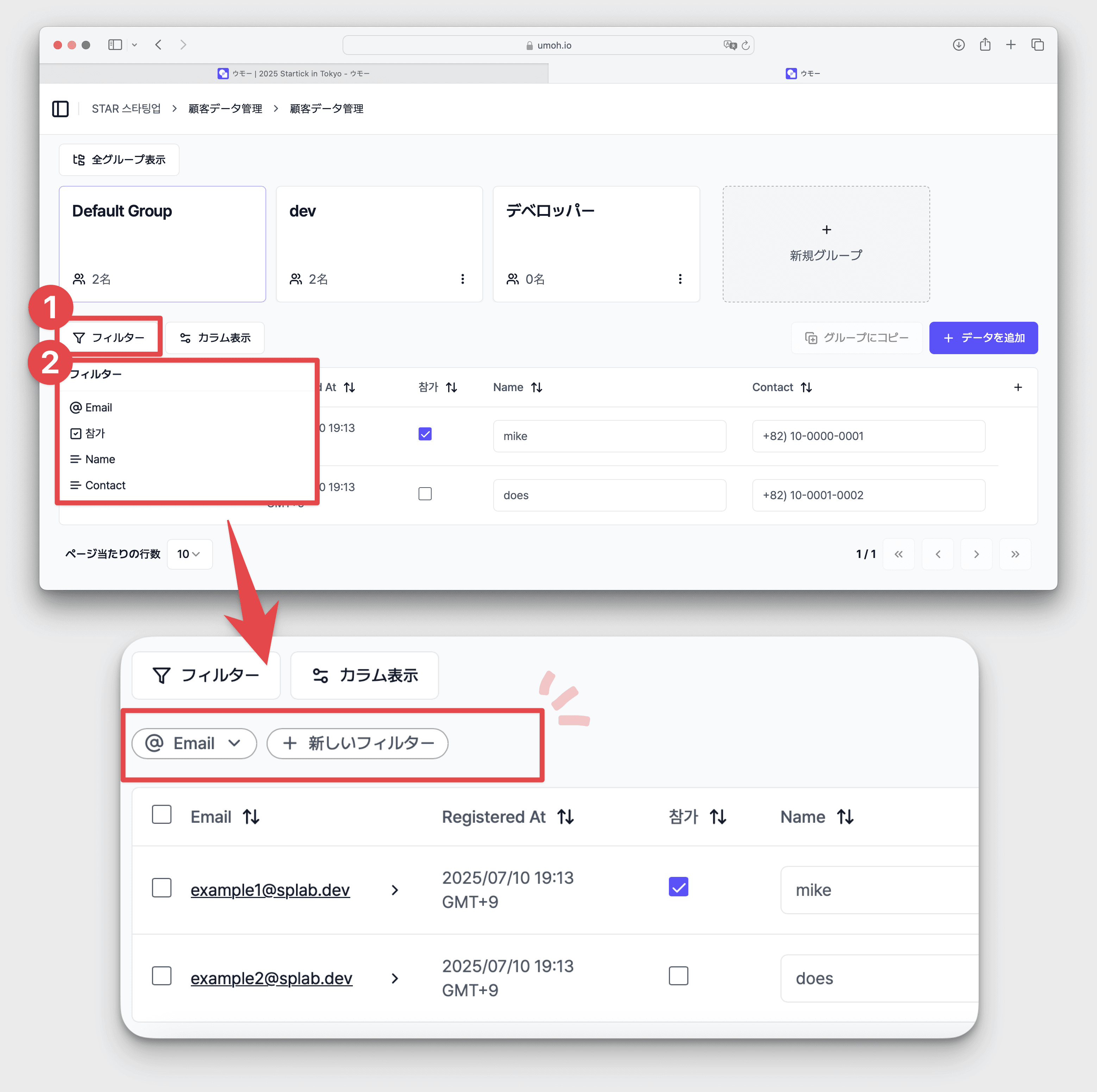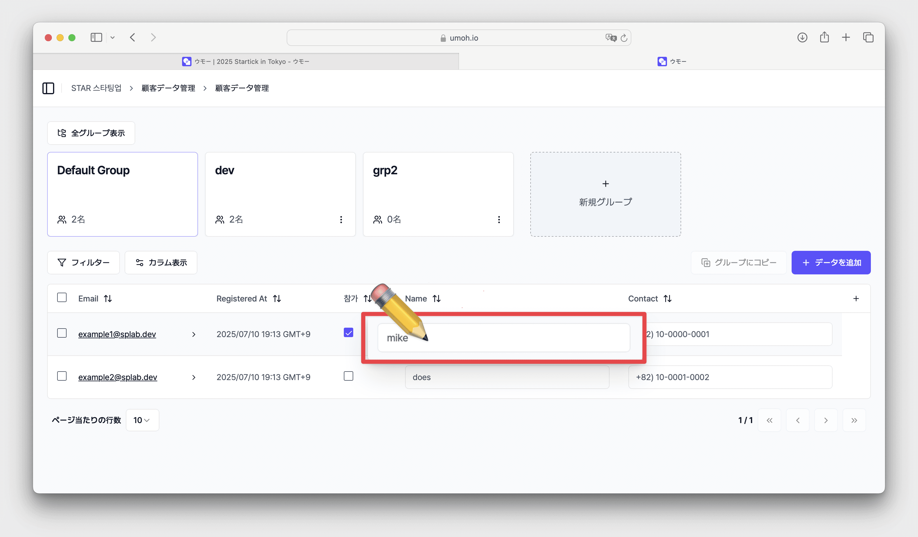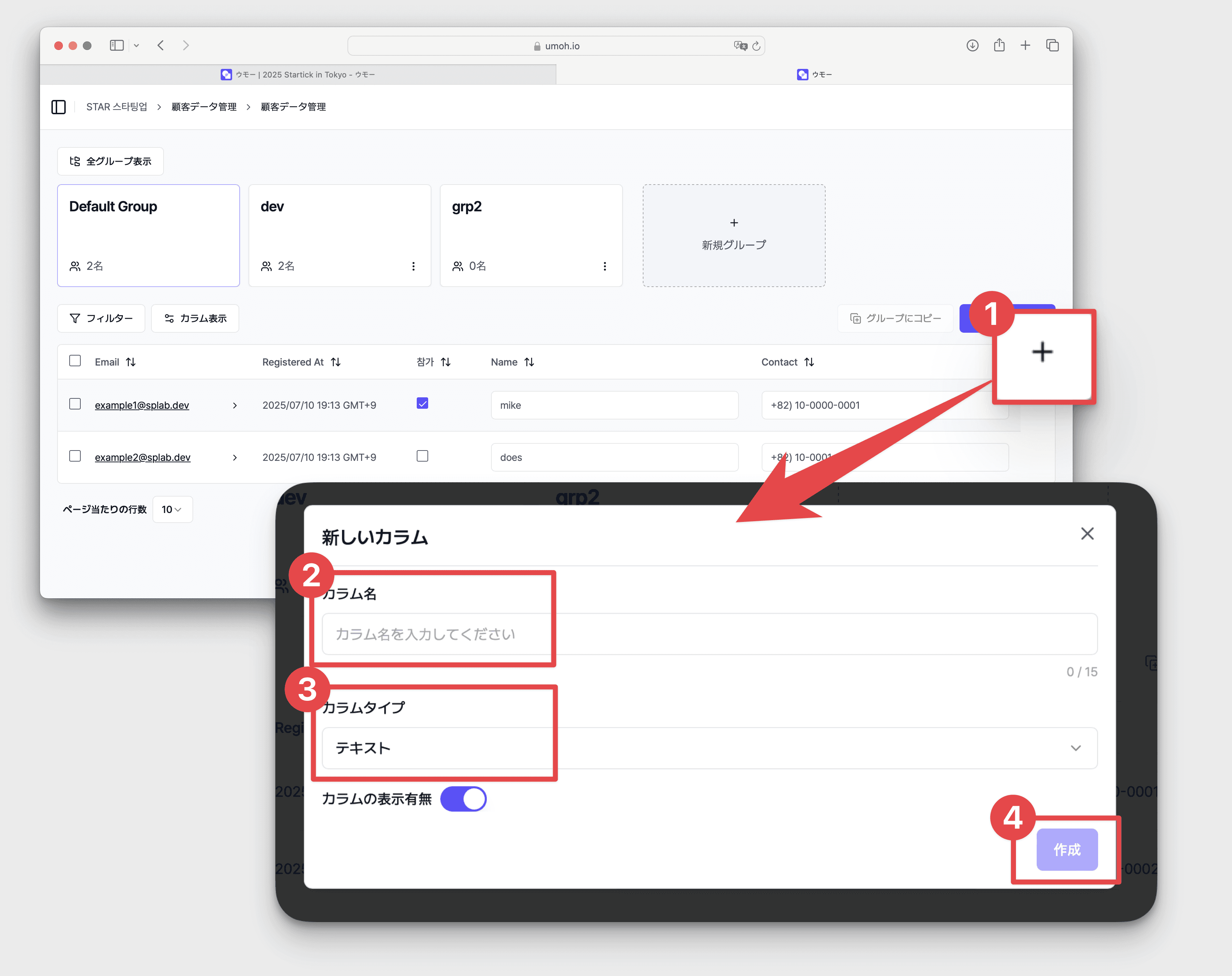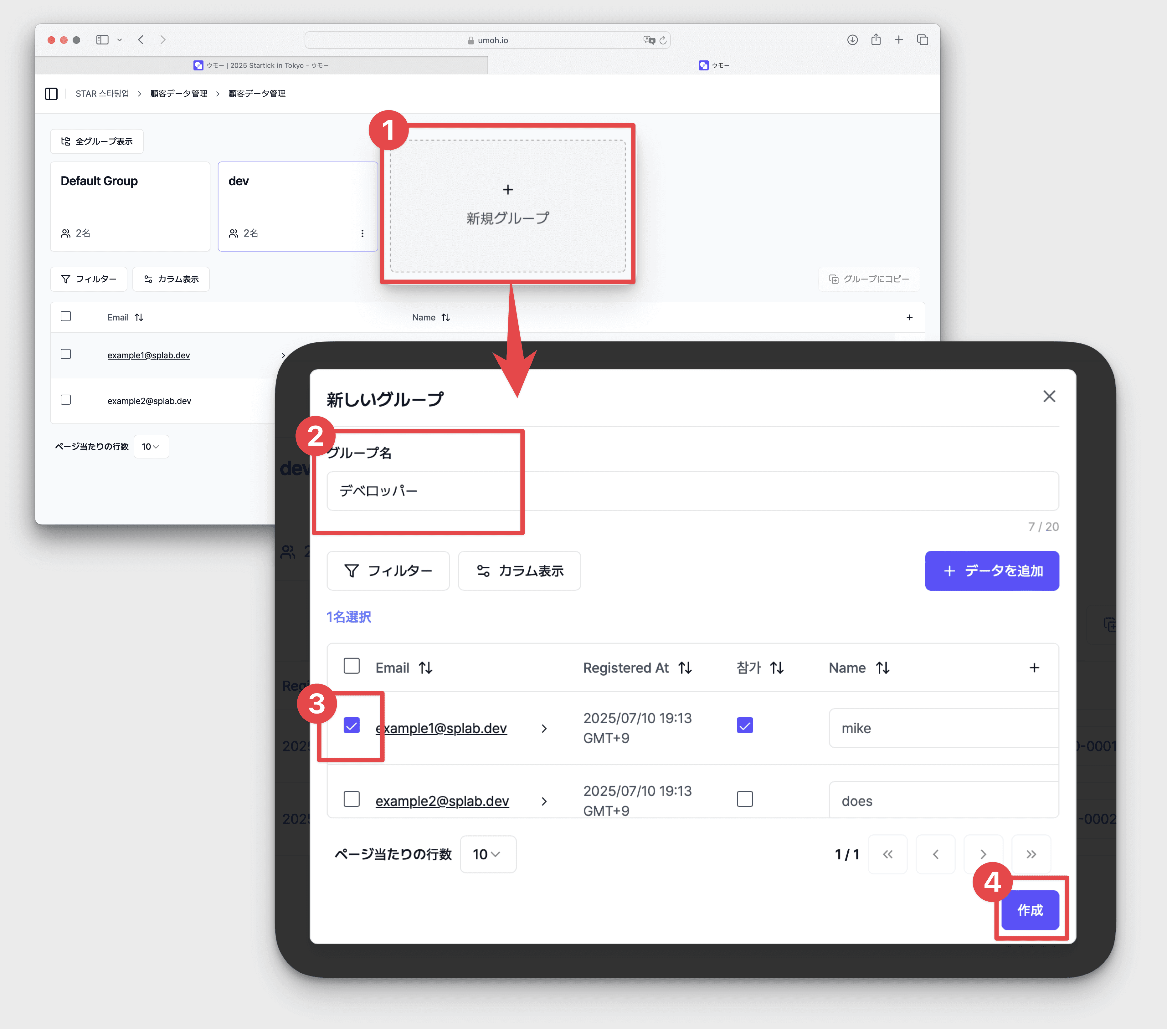 • 顧客データ管理メイン画面上部の[新しいグループ]ボックスをクリック → [グループ名]を記入 → グループに分類したい顧客データ左側の[チェックボックス]をクリック → [作成]をクリック