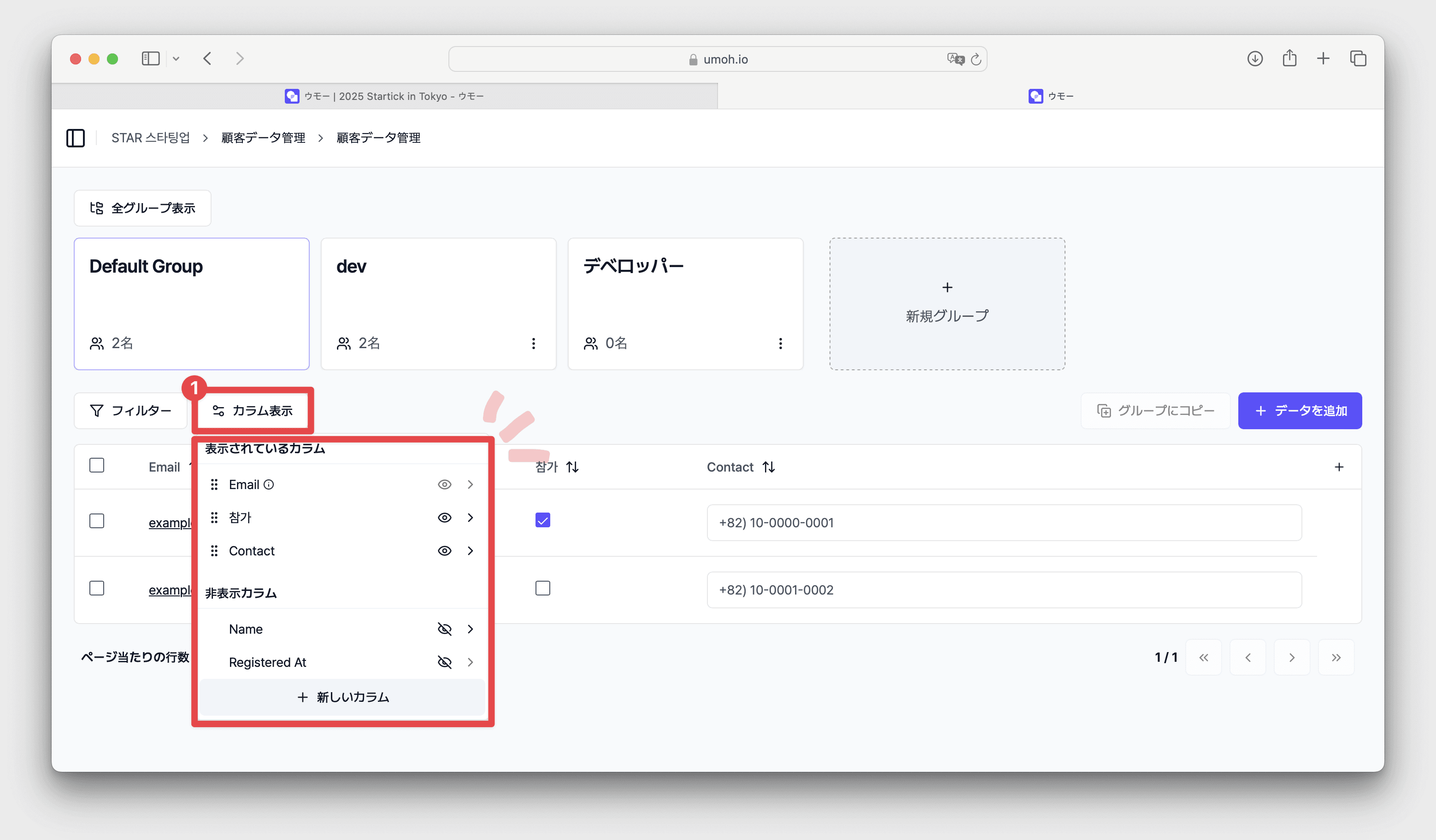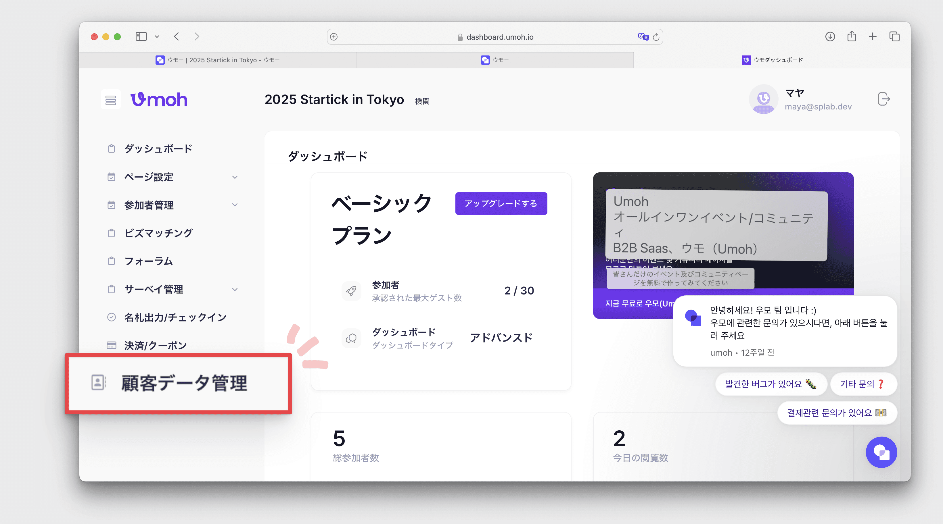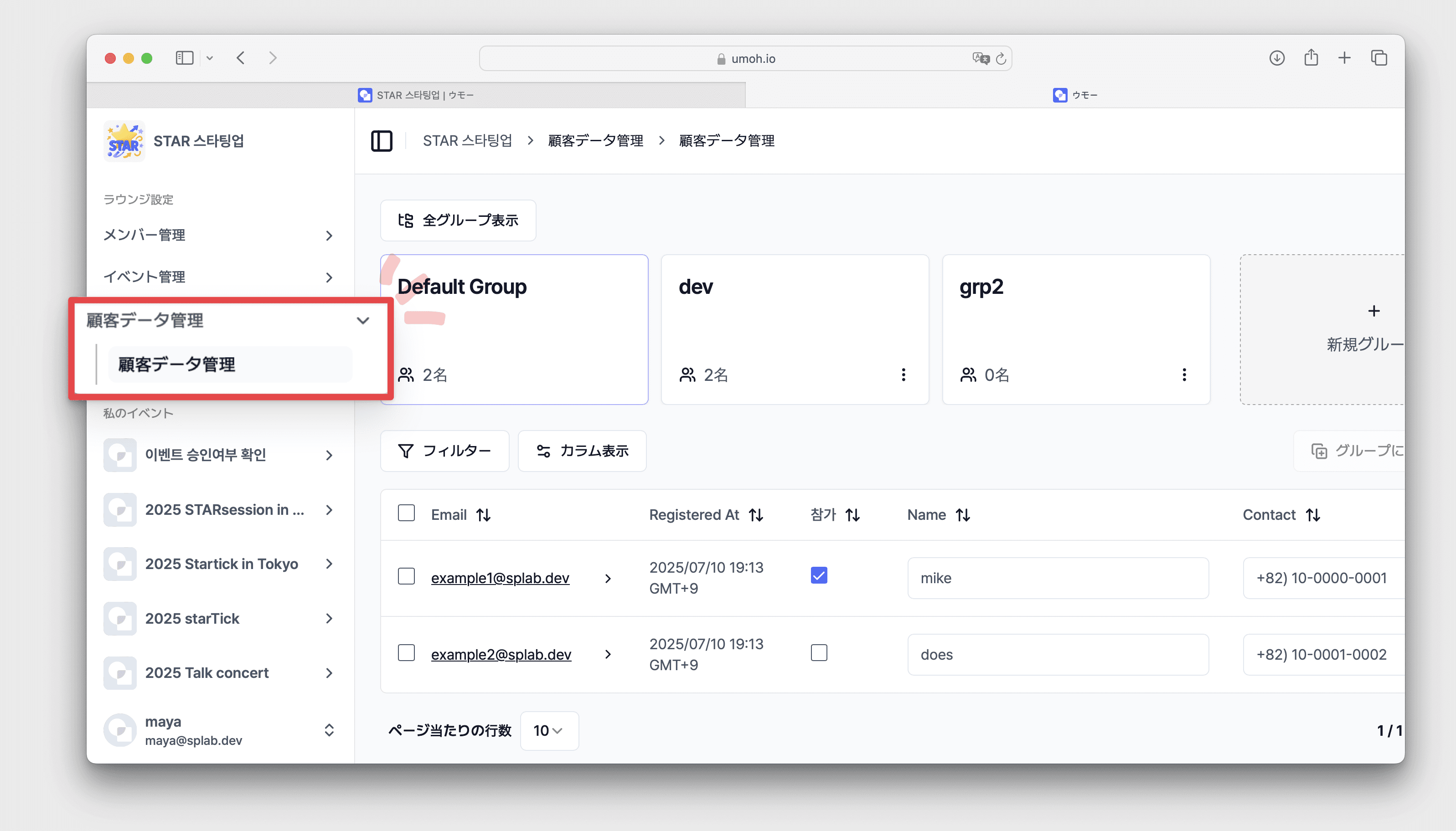 • イベント管理ダッシュボード左側の[顧客データ管理]をクリック → 顧客データ管理画面に移動