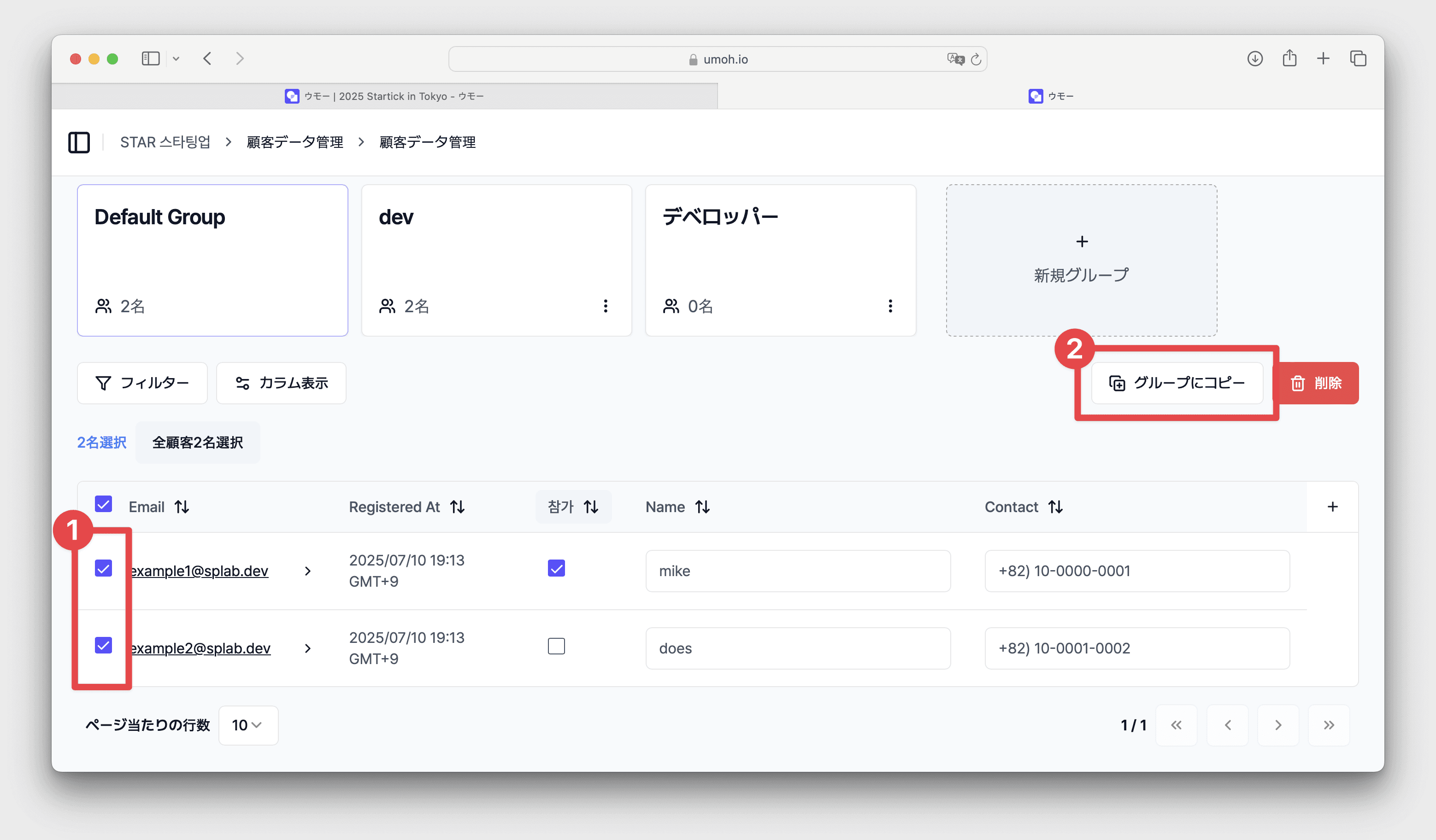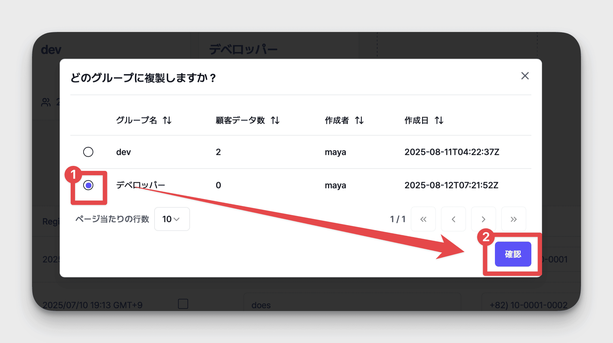 • 分類したいデータ左側の[チェックボックス]をクリック → 管理表右上の[グループに複製]をクリック