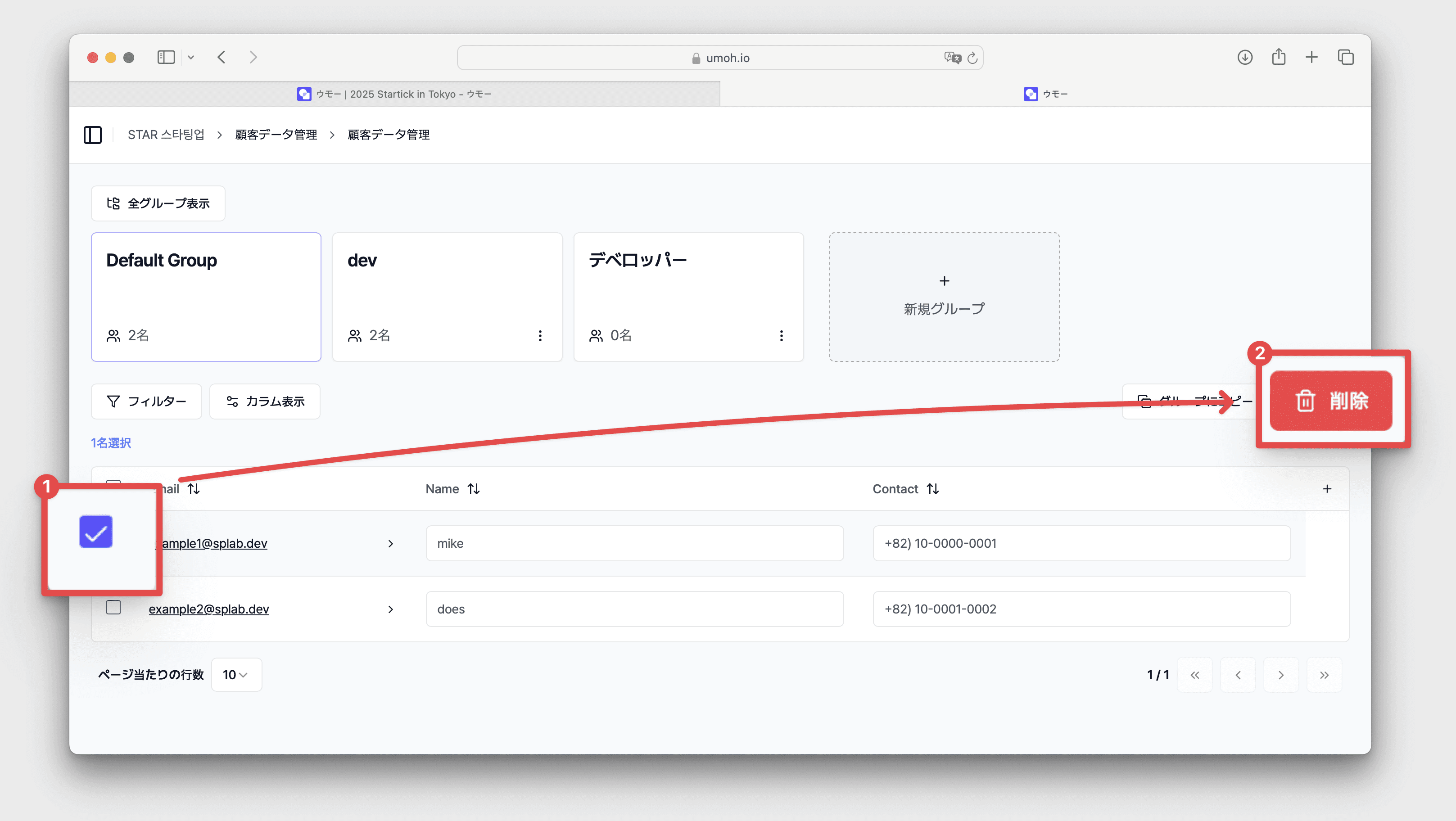 • 削除したい顧客データ左側の[チェックボックス]をクリック → [削除]ボタンをクリック