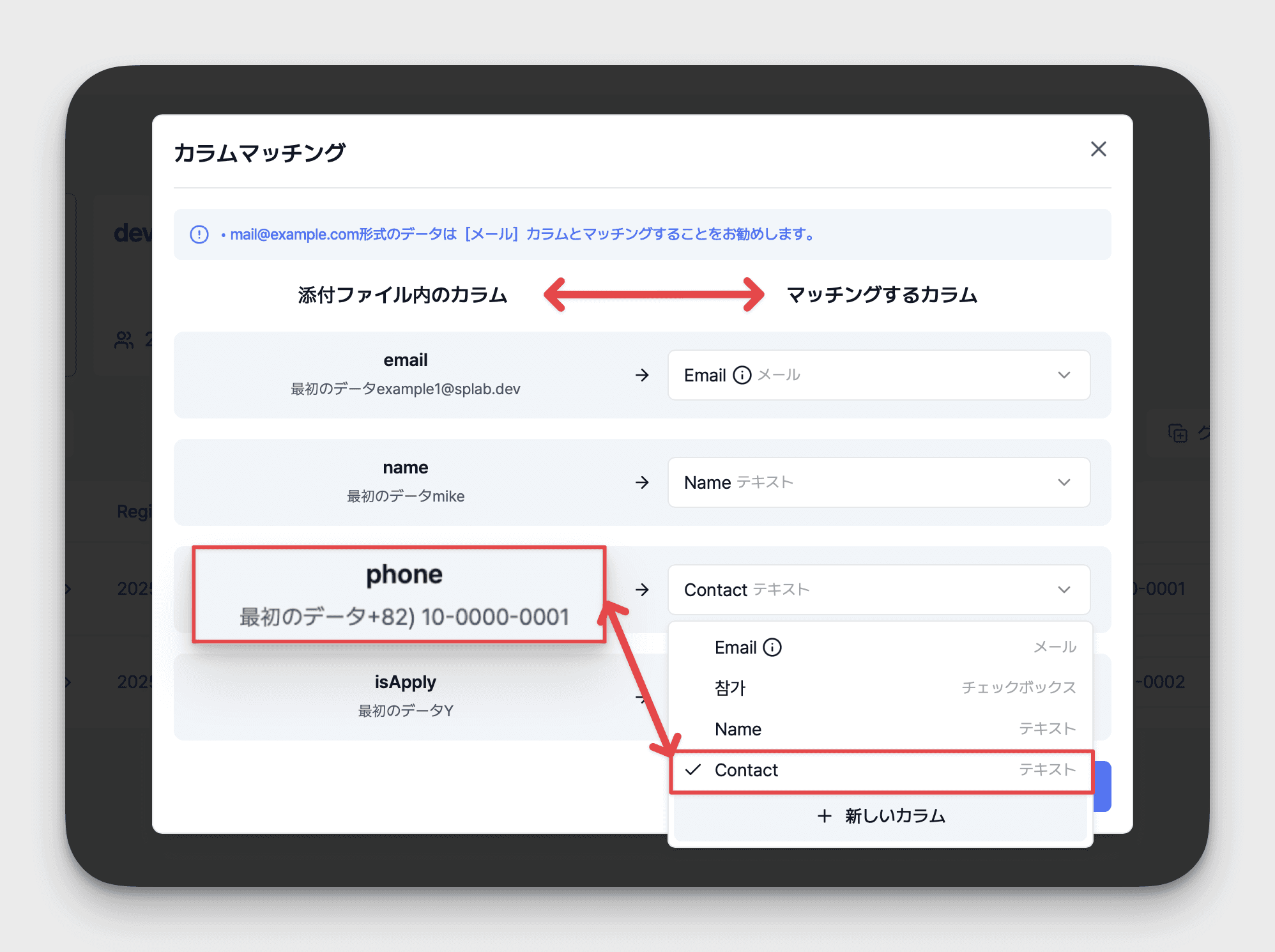• 右側の[マッチングする属性]リストの[属性を選択してください]をクリック → 添付ファイルデータ属性とマッチングする[属性]をクリック