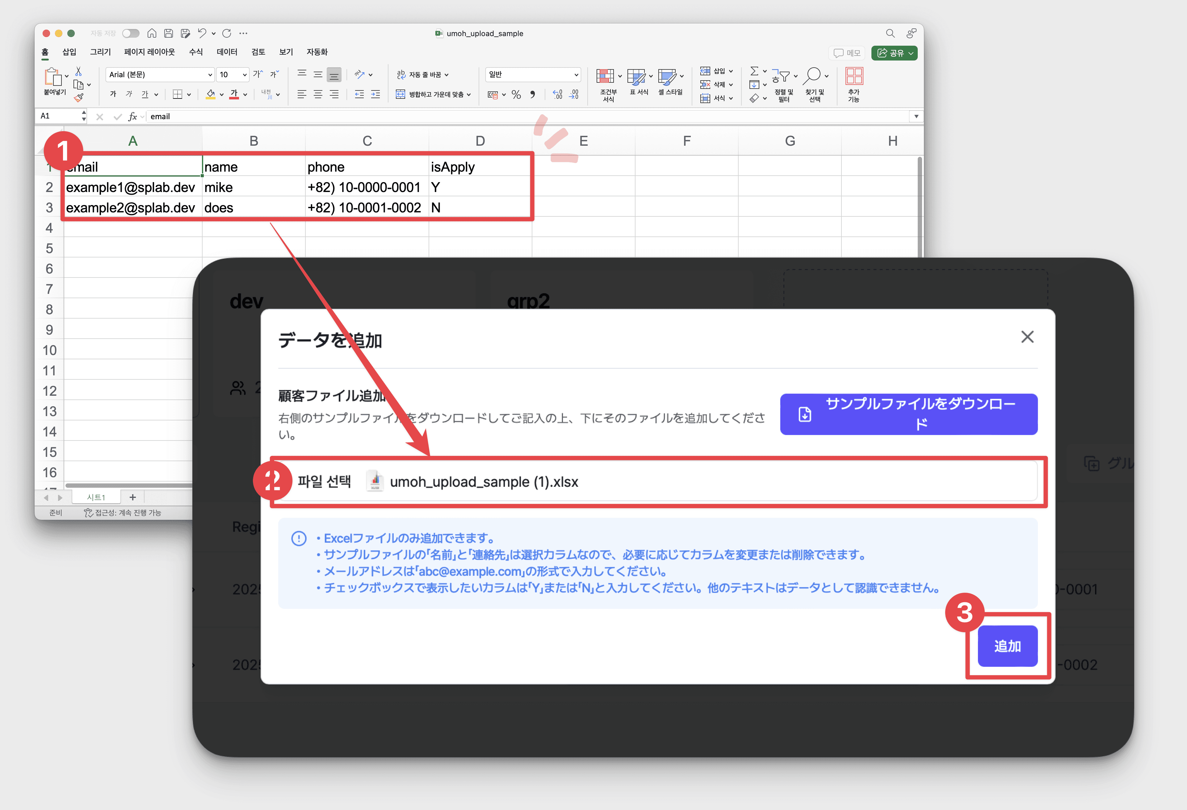 • [エクセルフォーマット]に従ってデータを入力 → [ファイル選択]をクリック → 完成した[エクセルファイル]をクリック → [追加]をクリック