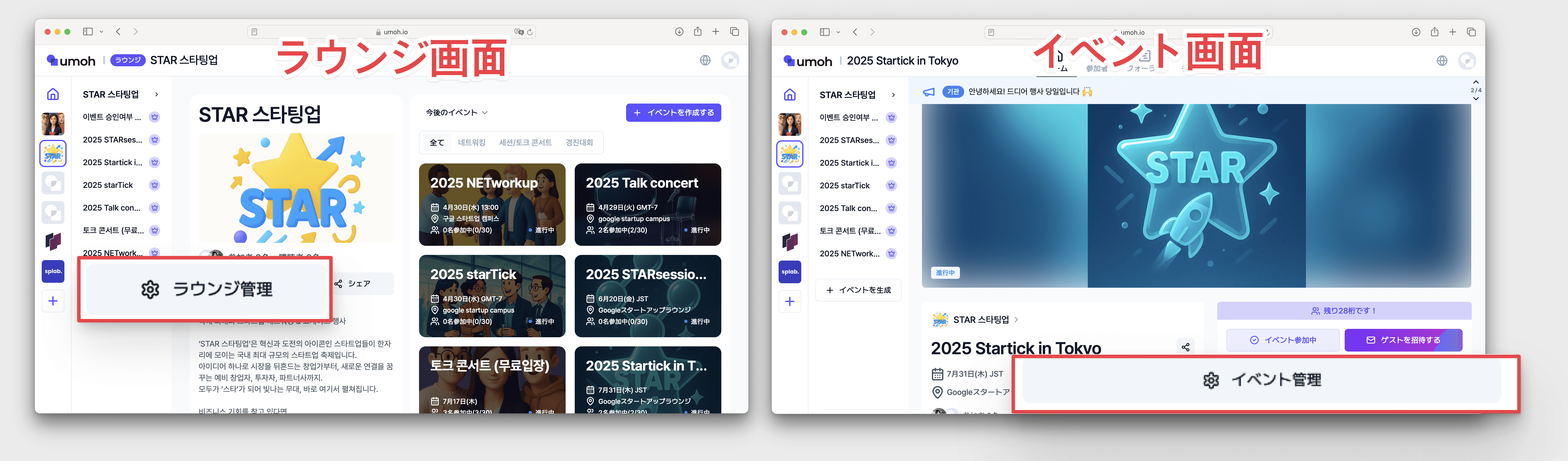 • ラウンジメイン画面で[ラウンジ管理]をクリック、またはイベントメイン画面で[イベント管理]をクリック