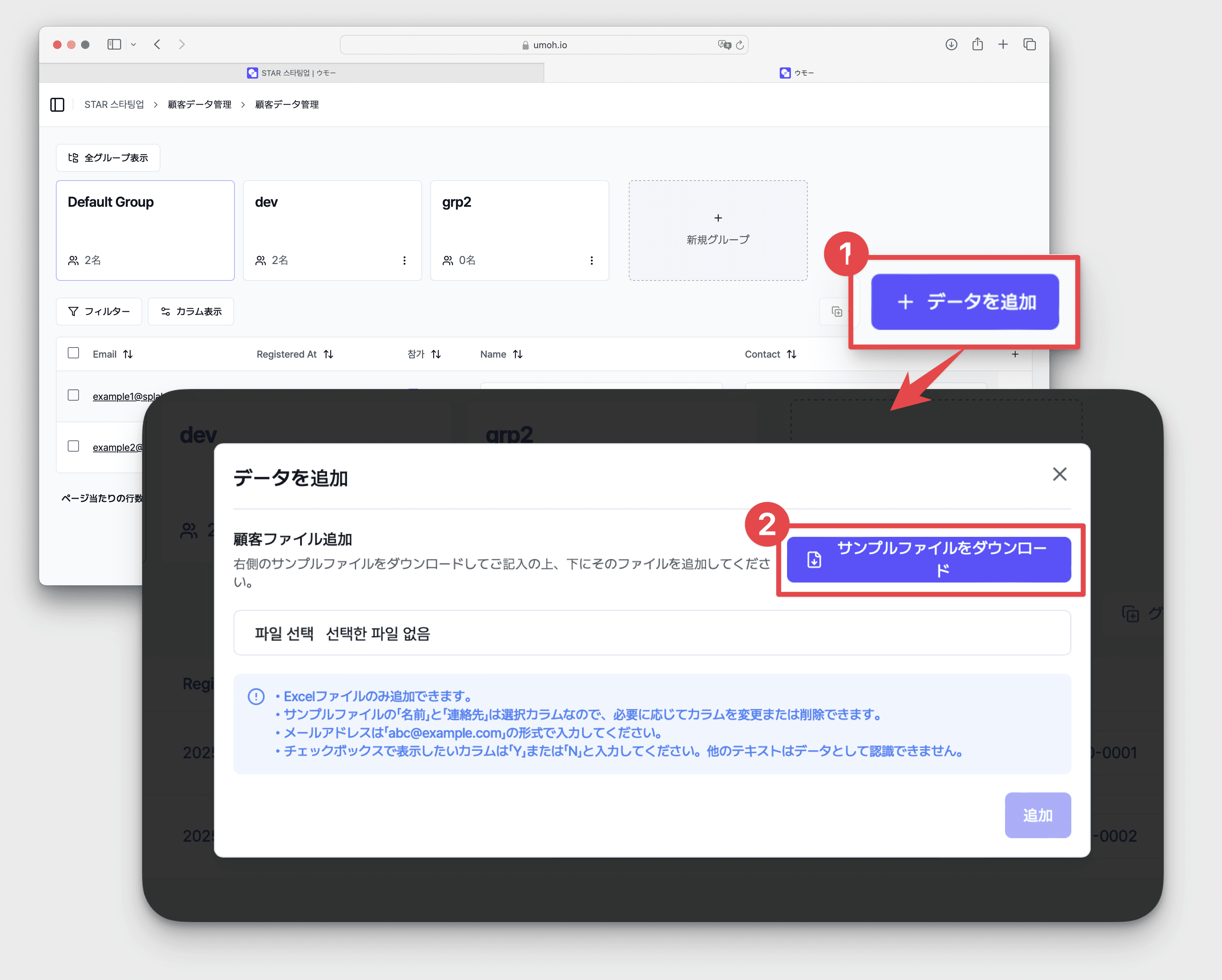 • データ管理画面右側の[データ追加]をクリック → データ追加ポップアップが開く → ポップアップ右側の[サンプルファイルダウンロード]をクリック