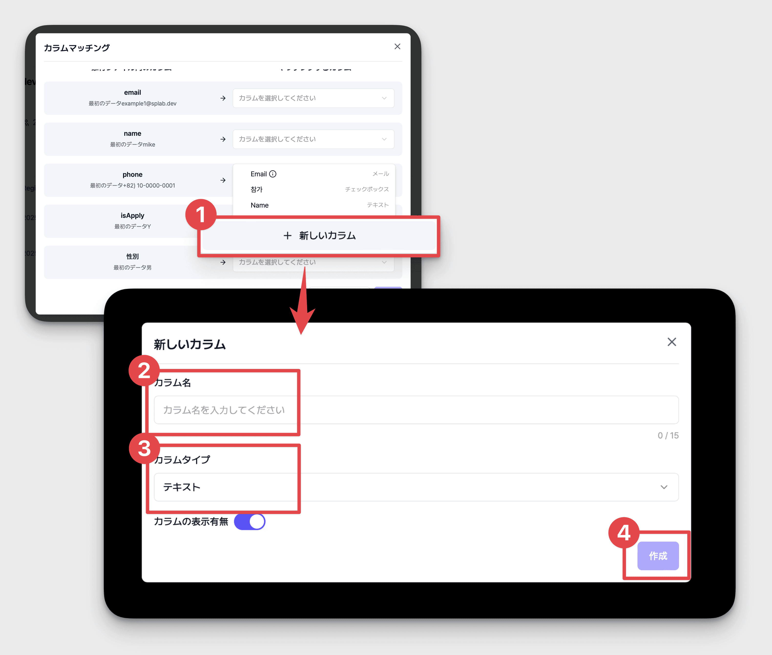 • [属性をクリックしてください]をクリック → [新しい属性]をクリック → データ管理画面に表示される[属性名]を記入 → 属性タイプに応じて[テキスト]または[チェックボックス]をクリック