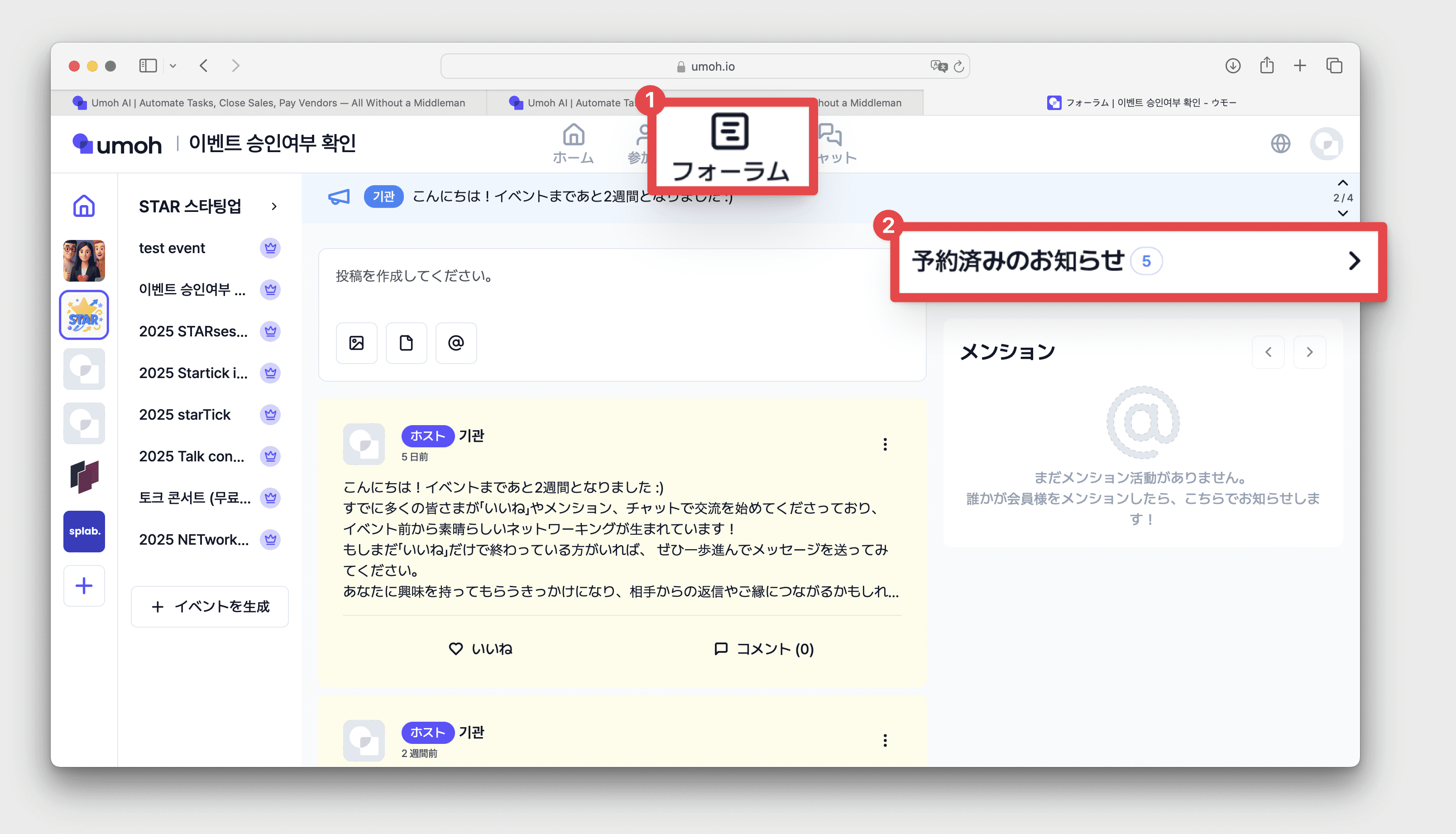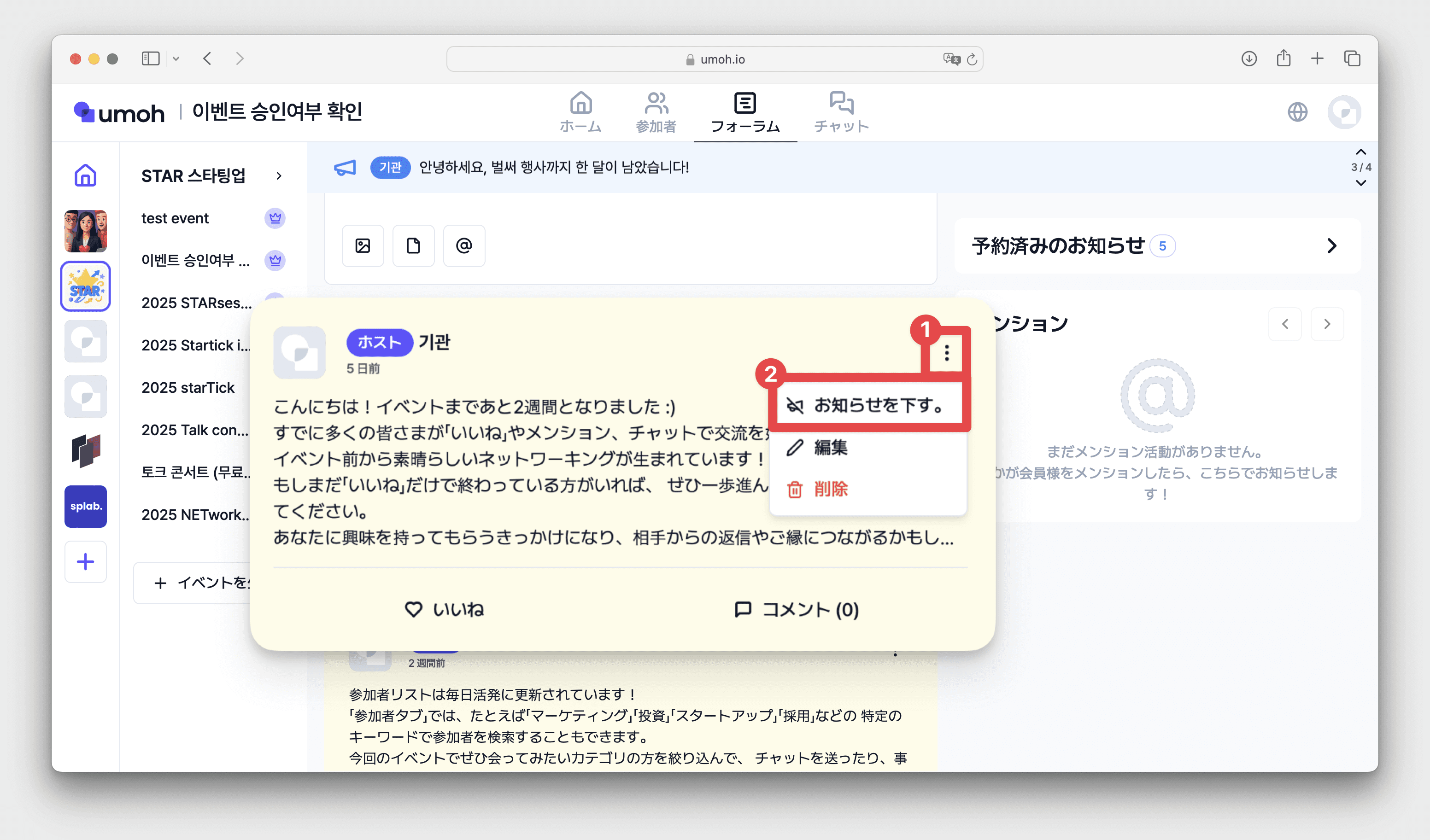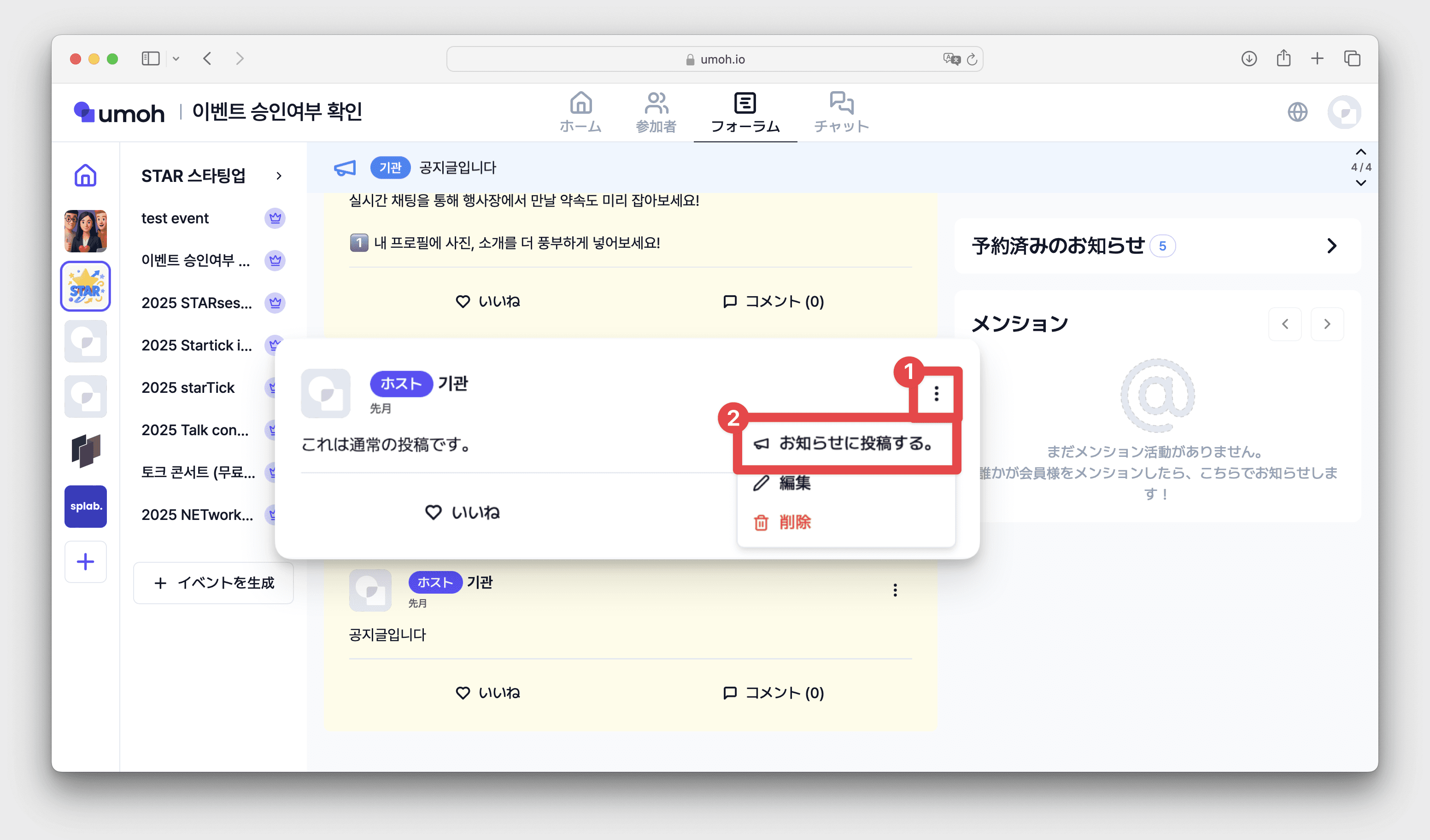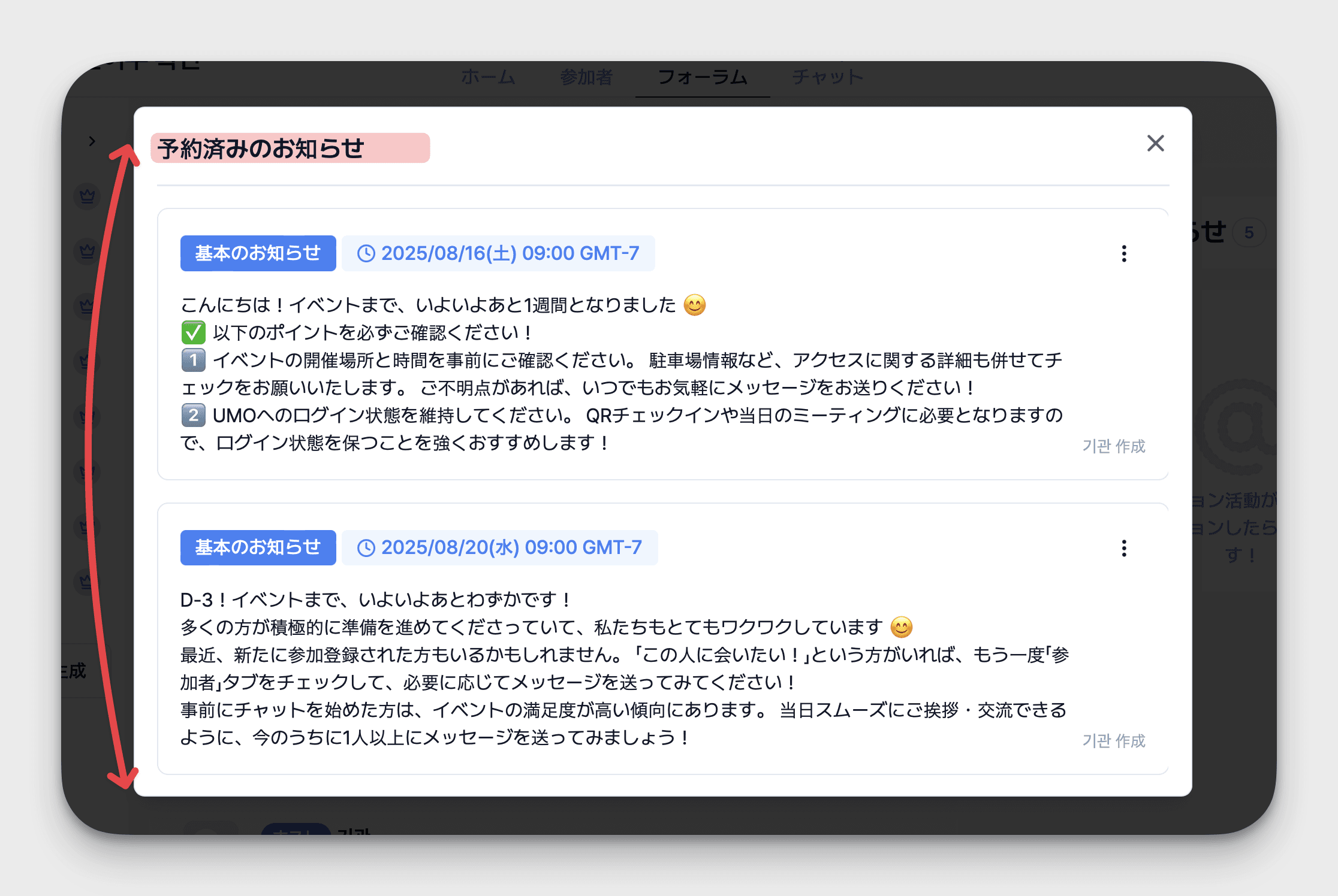 • イベント上部の[フォーラム]タブをクリック → 画面右上の[予約済みお知らせ]をクリック