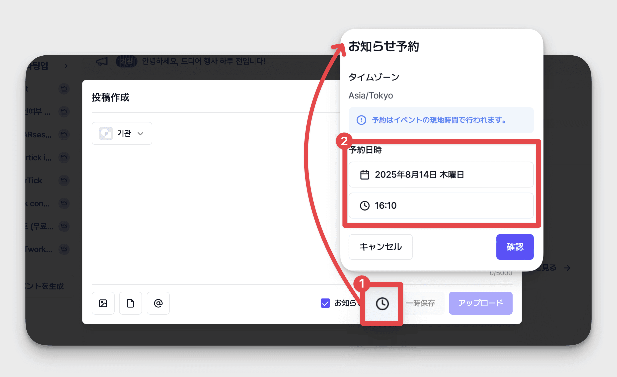 • 作成画面下部の[お知らせ]をクリックすると表示される[時計]アイコンをクリック → [予約日時]を設定 → [確認]をクリック