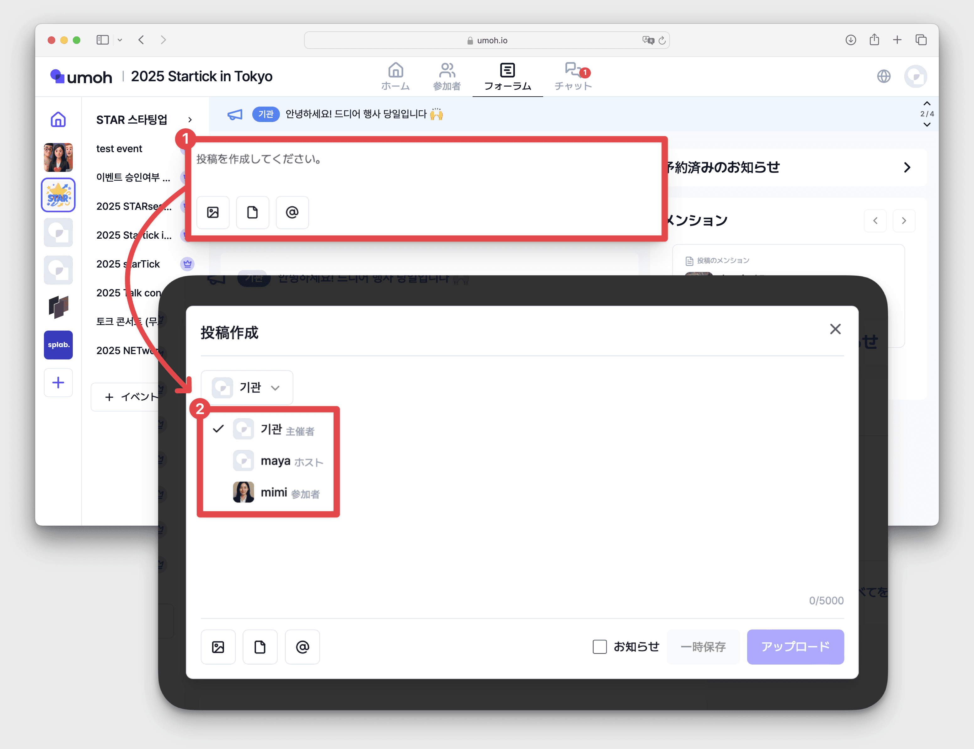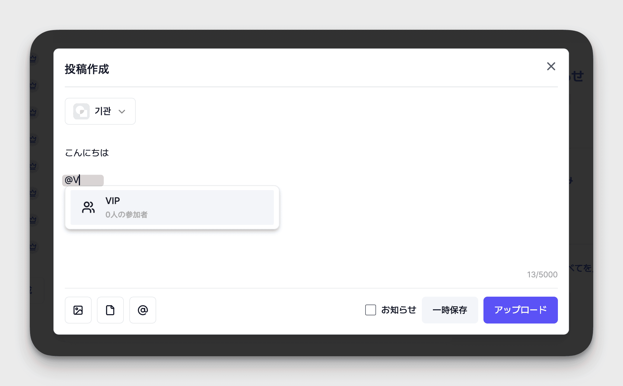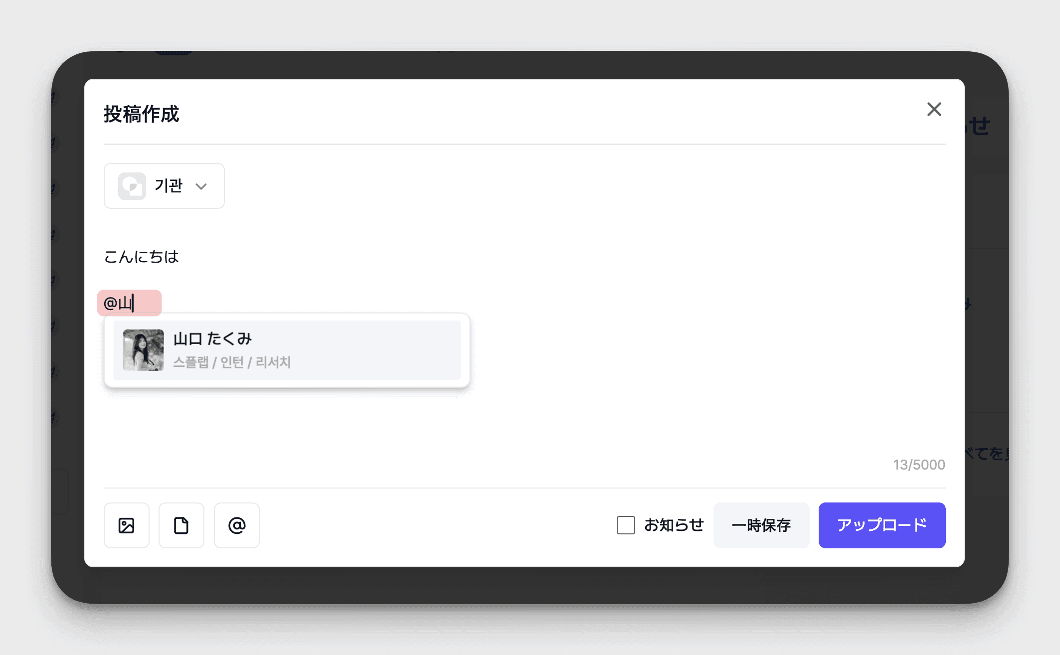 • @+[名前]を入力して参加者名を検索・タグ → 投稿作成後[アップロード]をクリック