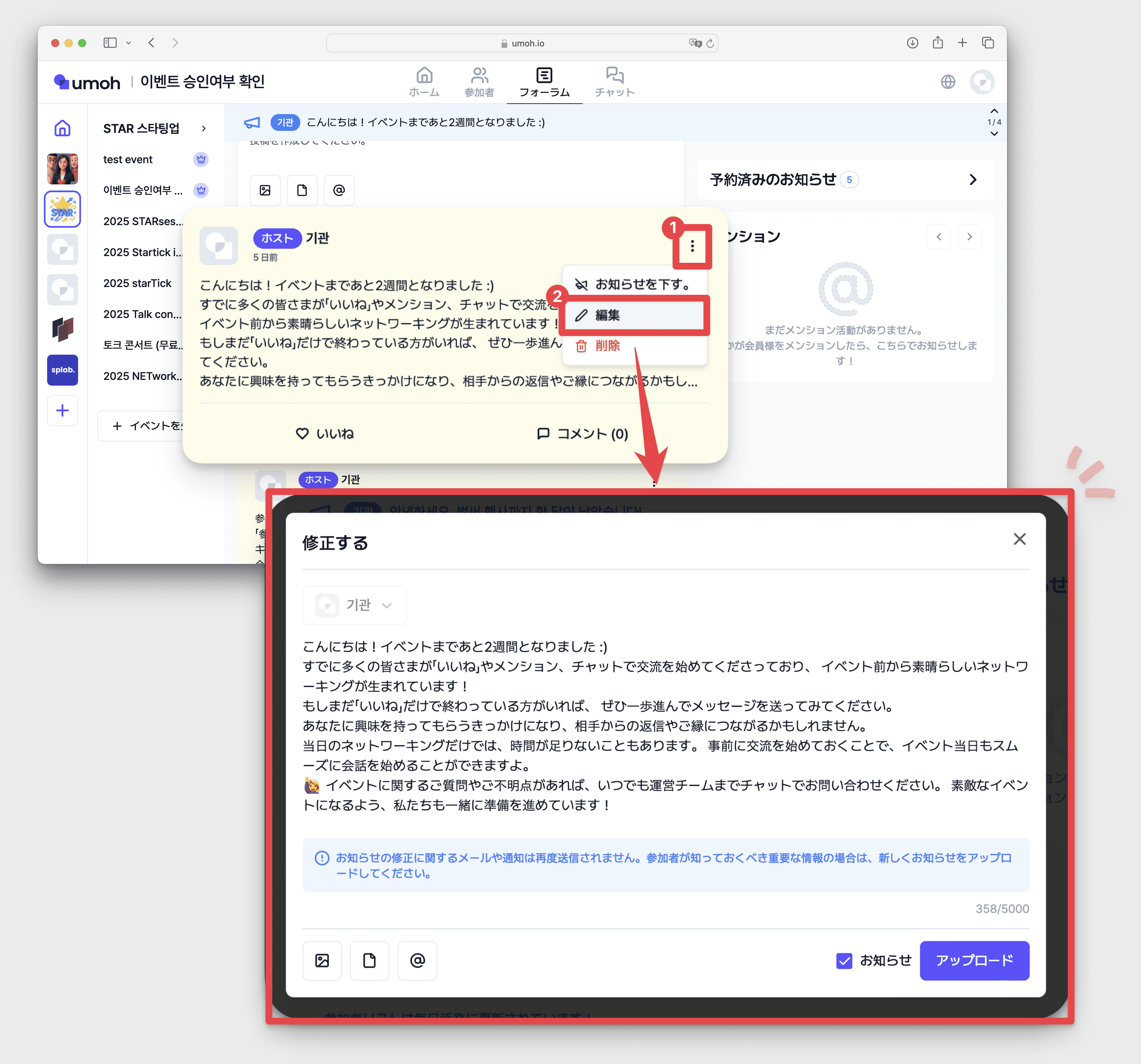 • フォーラムタブで修正したいお知らせの右側[...]ボタンをクリック → [修正]をクリック
