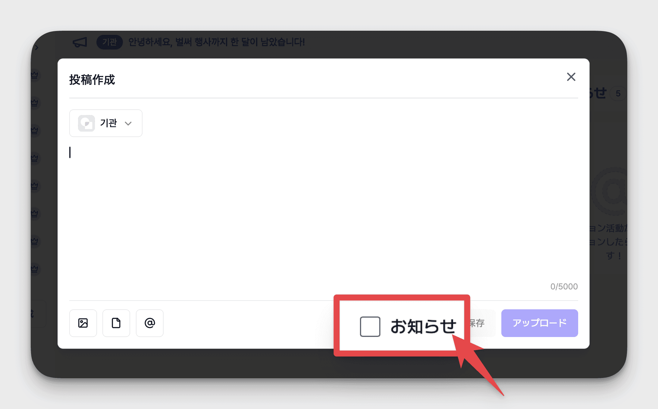• 作成ポップアップ下部の[お知らせチェックボックス]をクリック → [アップロード]をクリック