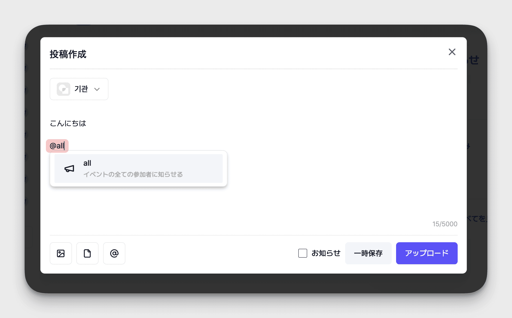 • [@all]を入力して全参加者をタグ → 内容を作成後[アップロード]をクリック