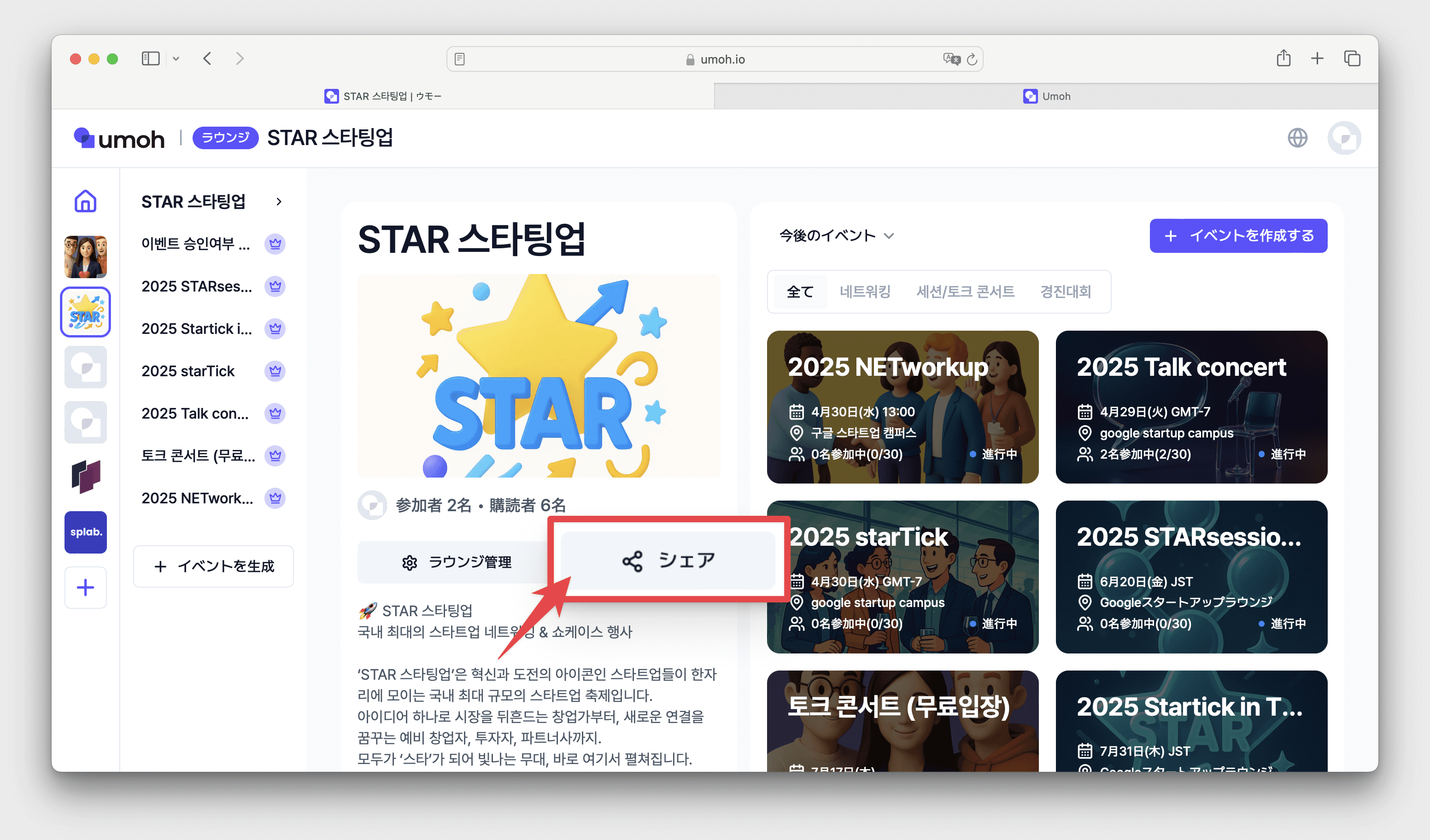ラウンジサムネイルの下にある[共有する]をクリック → リンク送信