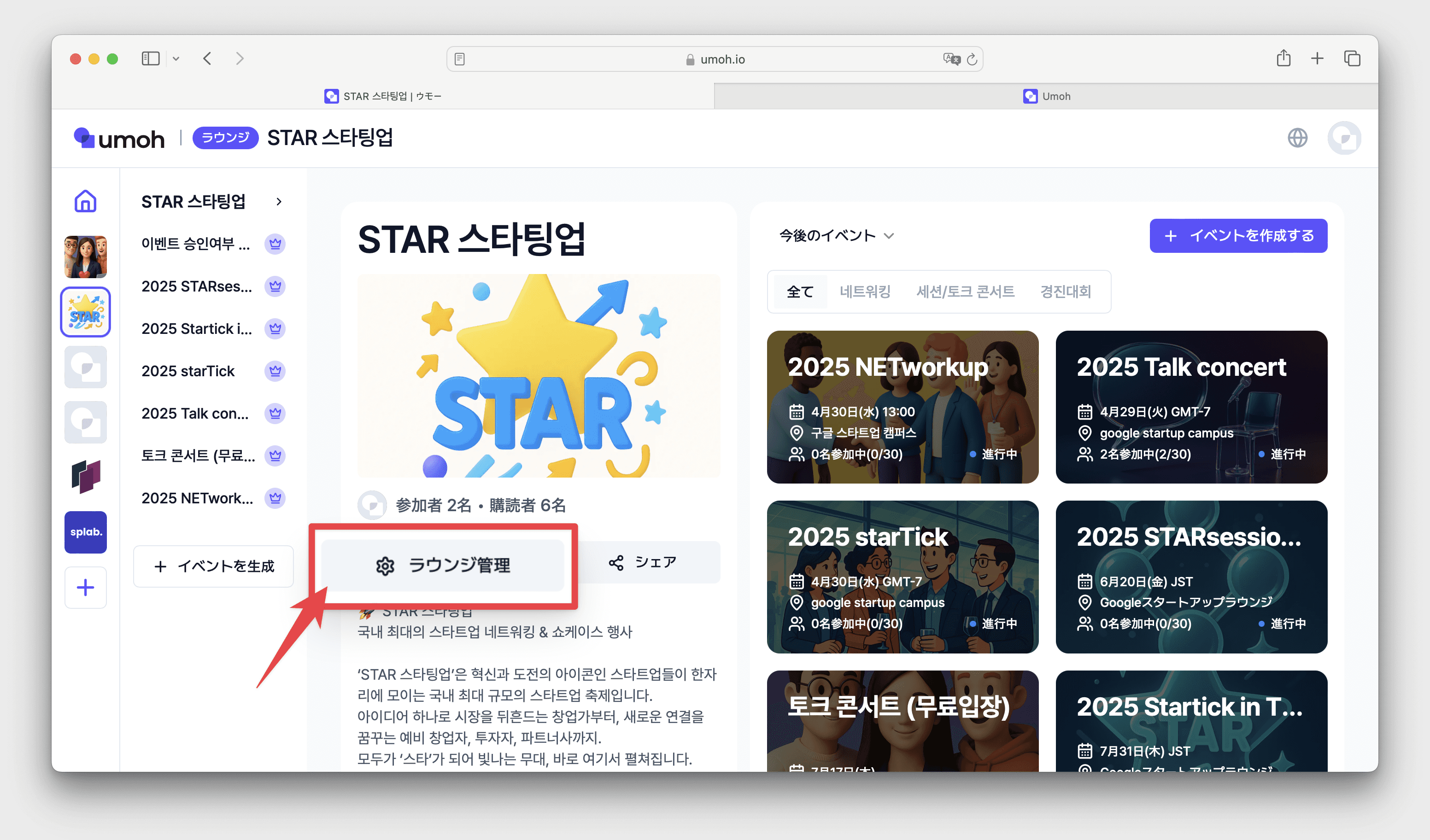 ラウンジ代表画像の下にある[ラウンジ管理]をクリック