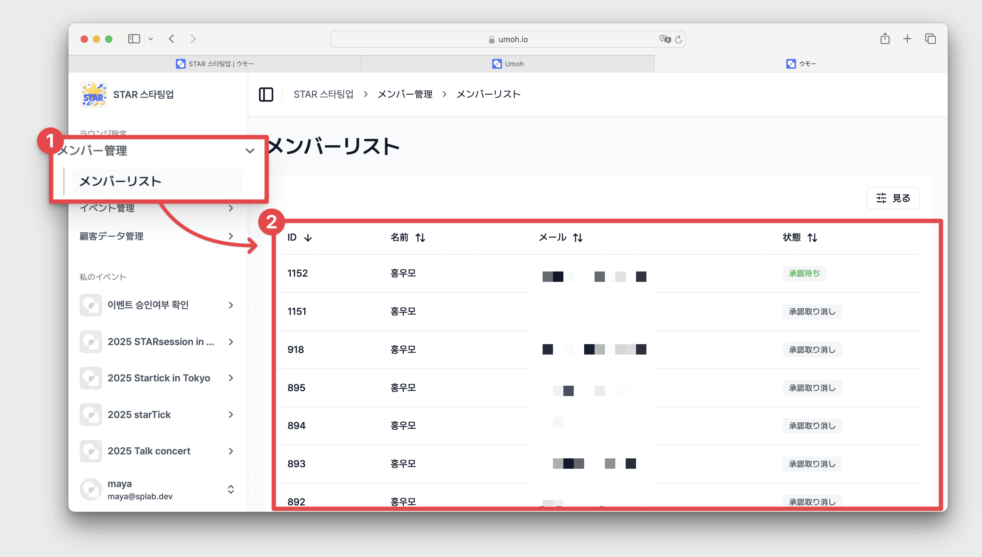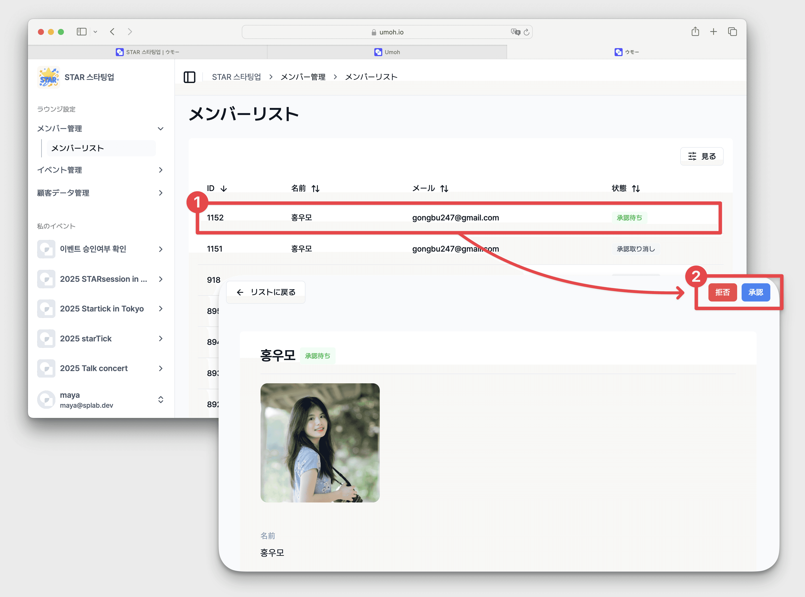 メンバーリストで[承認待ち]をクリック → [拒否/承認]をクリック
