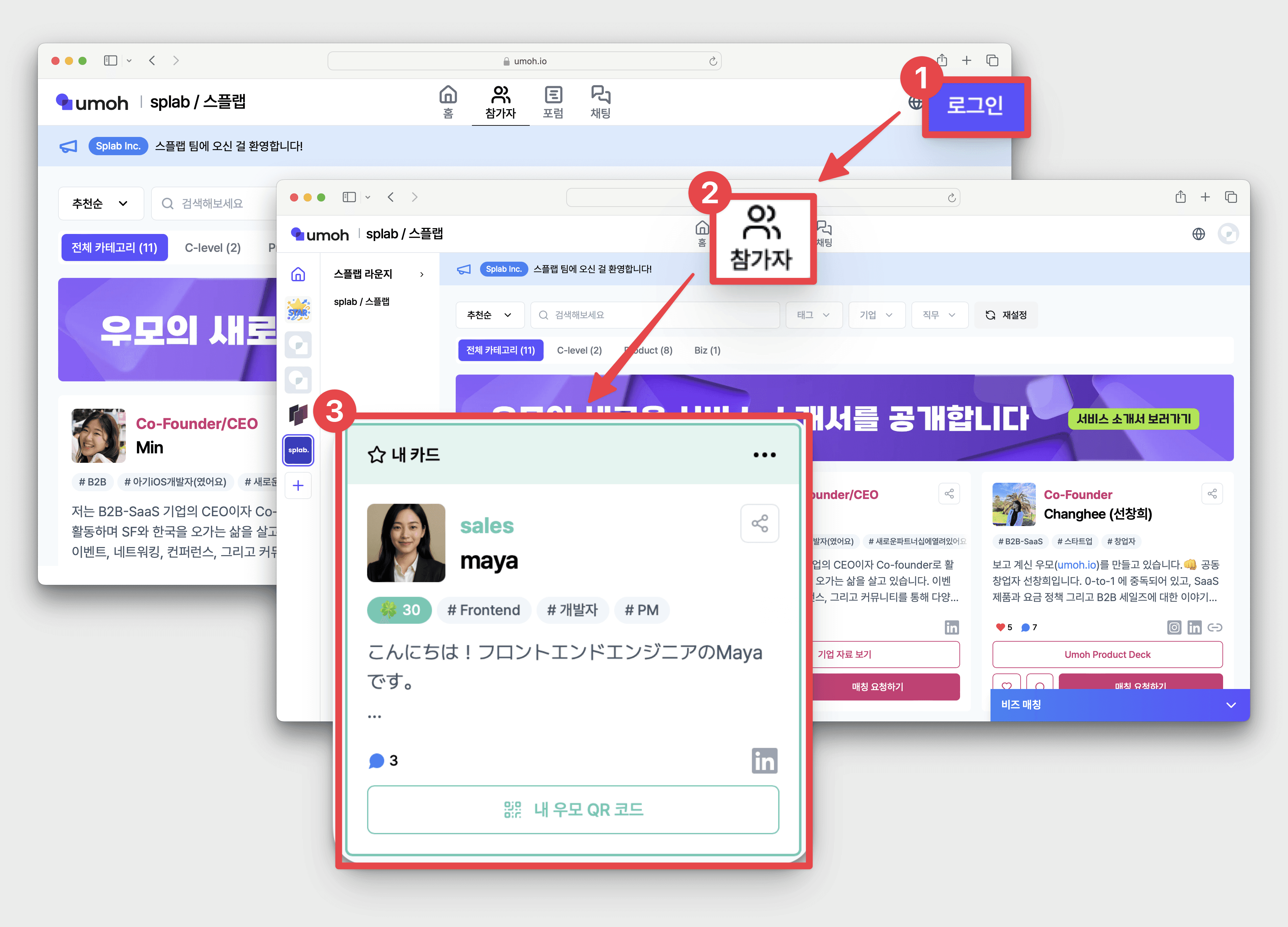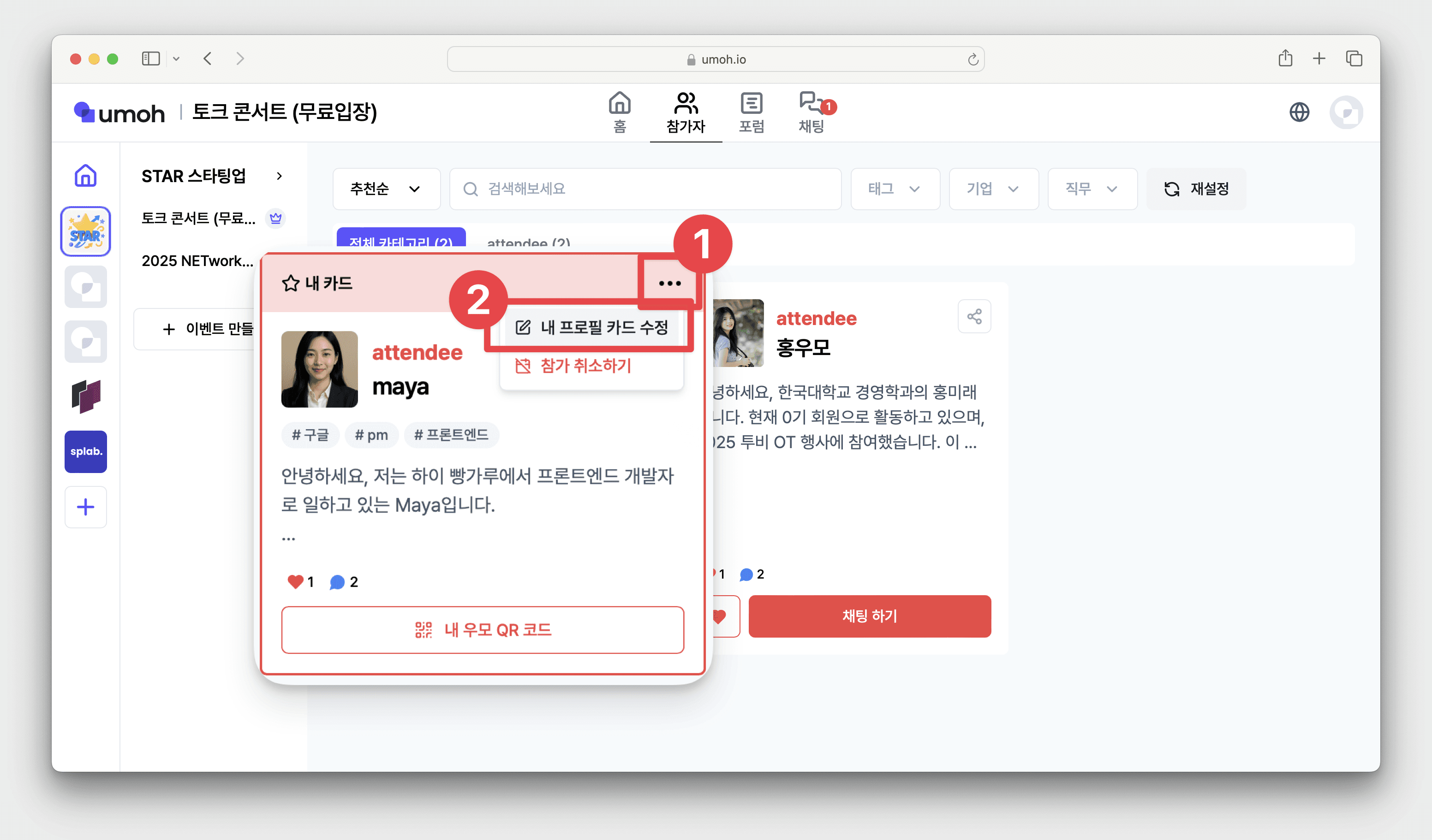우모 [로그인] → 내가 참가한 이벤트 화면 상단 [참가자 탭] 클릭 → [내 카드] 확인 가능