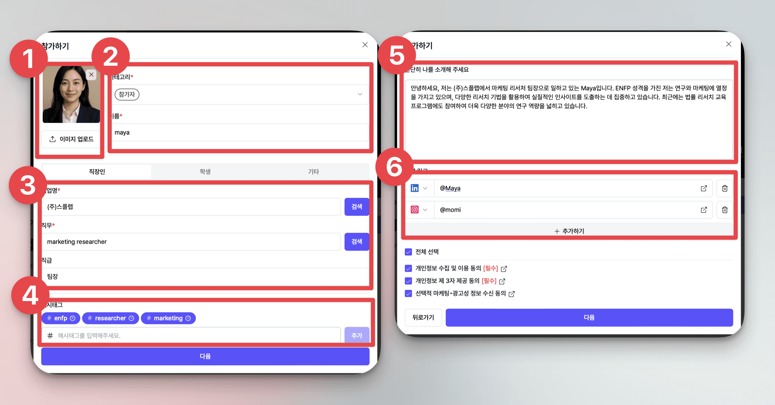 자세하게 작성할 수록 다른 참가자가 나를 잘 알아볼 수 있고, 네트워킹 기회가 많아져요!