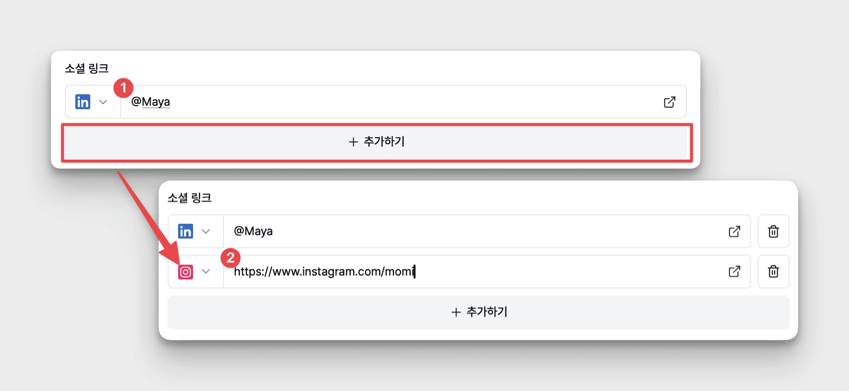 [@소셜계정이름] 입력 / [소셜 링크 전체]를 입력 → [추가하기] → 더 많은 채널 추가 가능