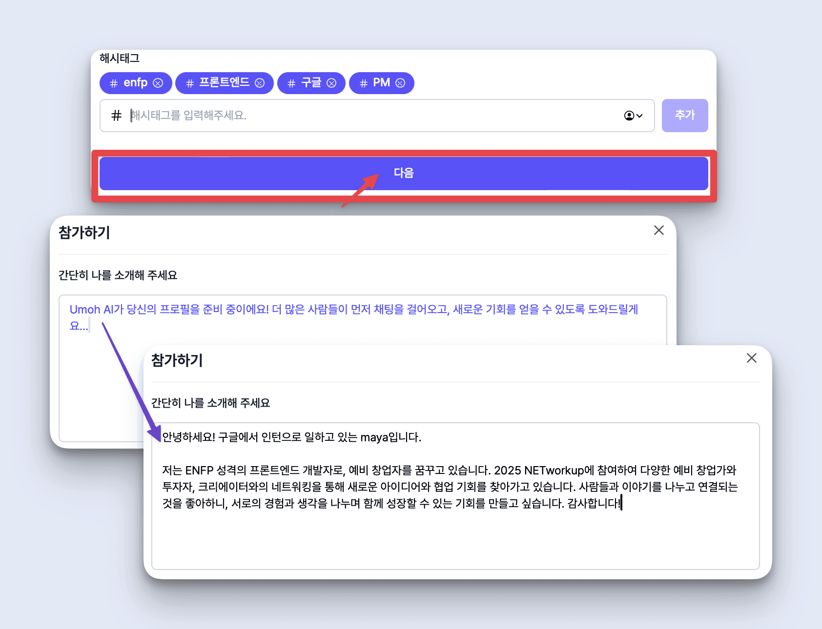 다양한 해시태그를 추가할수록 다른 참가자가 나를 찾기 쉬워져요.